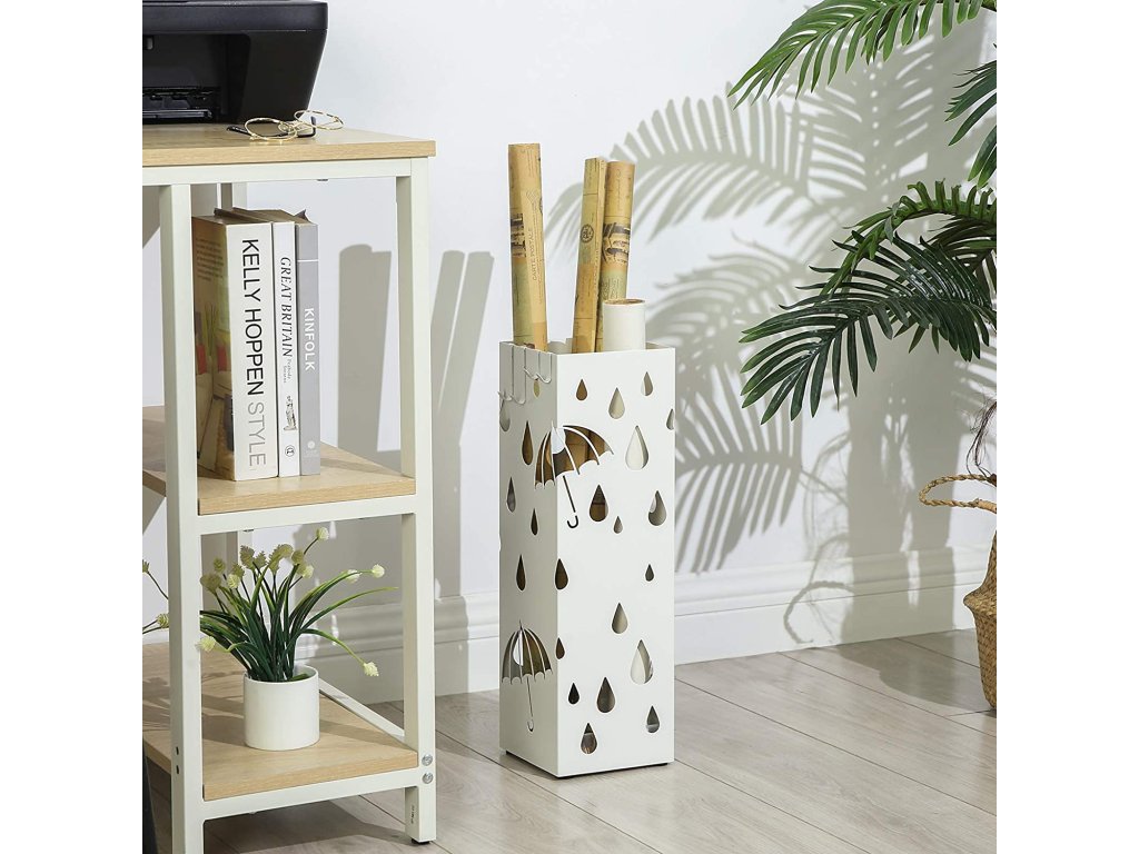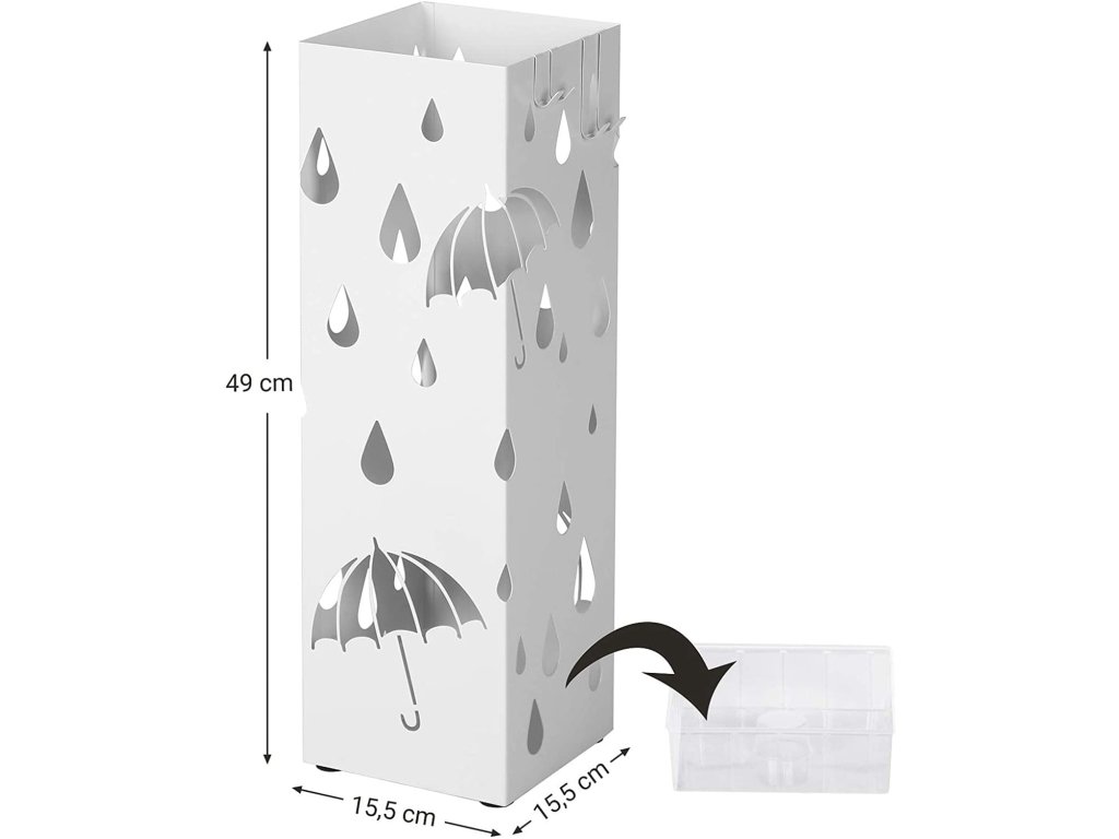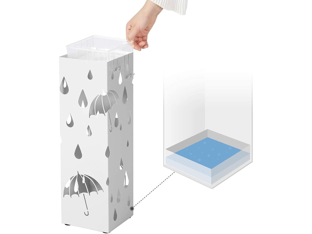 Stojan na deštníky je vybaven odnímatelnou plastovou vaničkou na vodu, která chrání podlahu před vlhkostí. Už nemusíte sušit rozložený deštník na dlaždicích, jednoduše umístěte mokrý deštník dovnitř stojanu a veškerá voda odteče přímo do odtokové vaničky.