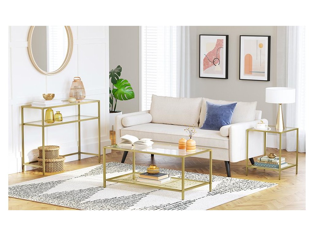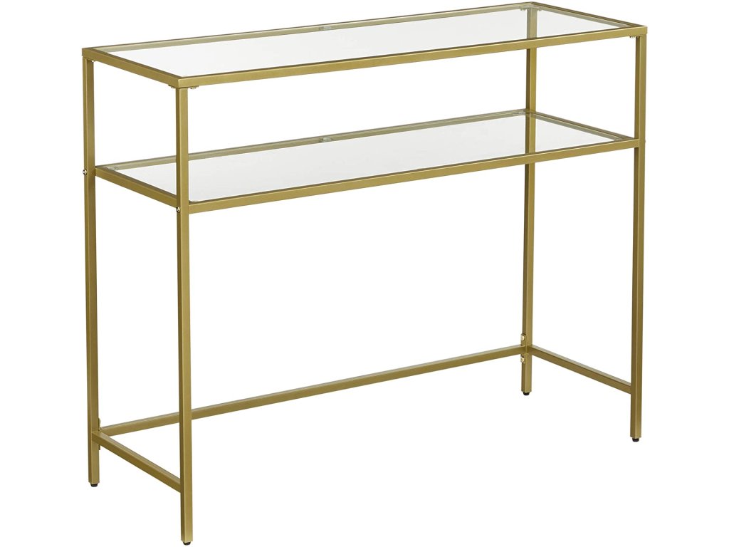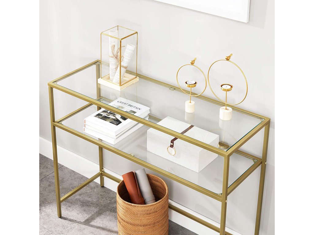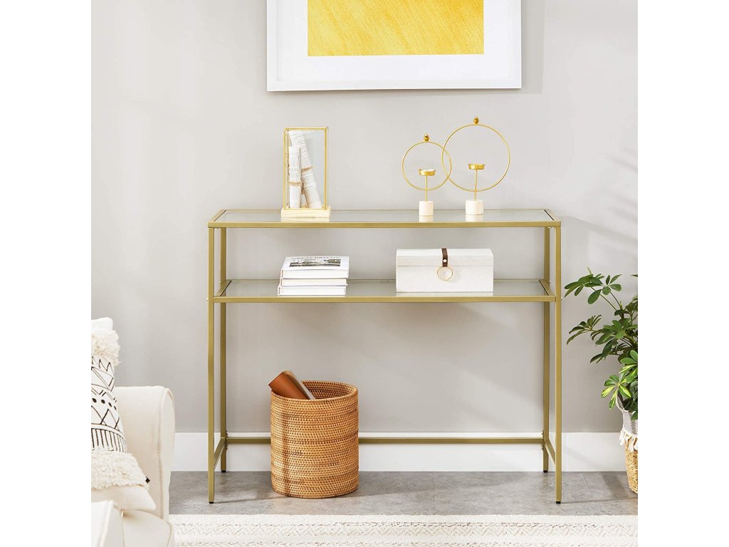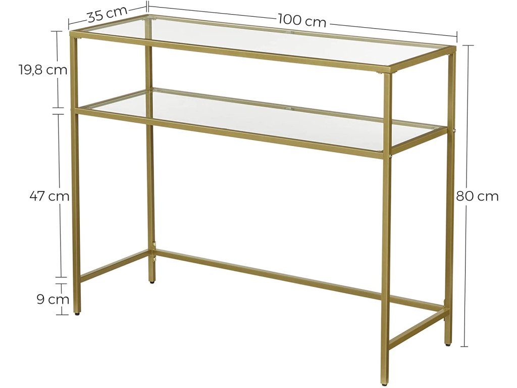 Konzola ze skla a kovu se zlatým práškovým nástřikem. Výrobek vytvoří úžasnou dekoraci vašeho pokoje. Police konzole jsou stabilní, takže na ně můžeme umístit knihy, květiny ve vázách, dekorativní figurky, dětské hračky a rámečky na fotografie. Vhodné rozměry konzoly poskytují dostatek prostoru pro naše věci.