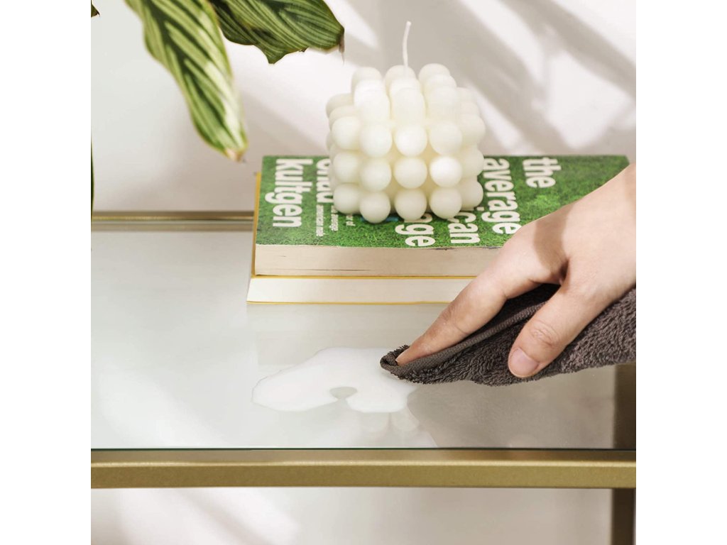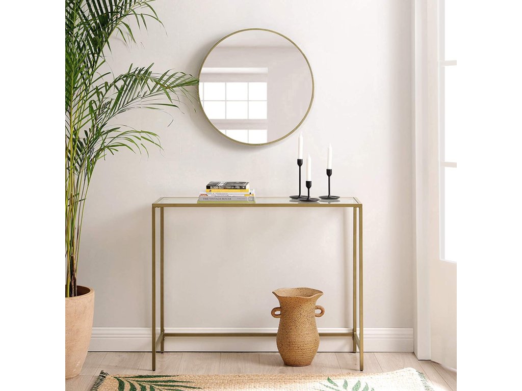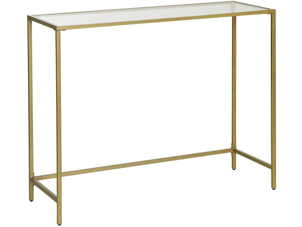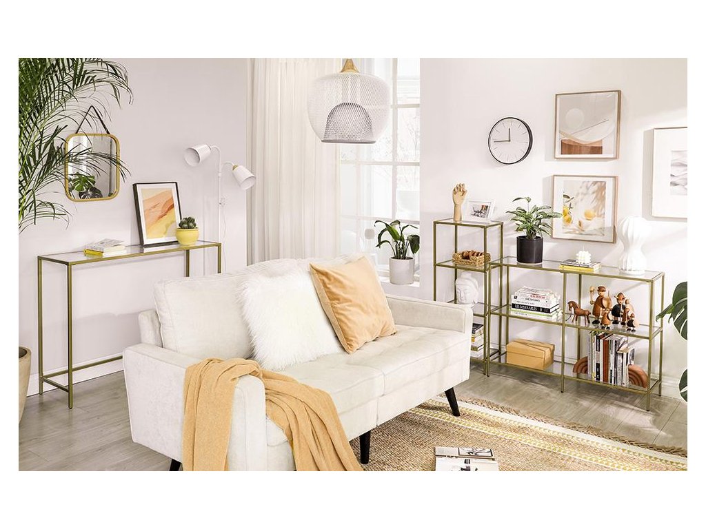 Konzola ze skla a kovu se zlatým práškovým nástřikem. Výrobek vytvoří úžasnou dekoraci vašeho pokoje. Police konzole je stabilní, takže na ni můžeme umístit knihy, květiny ve vázách, dekorativní figurky, dětské hračky a rámečky na fotografie. Vhodné rozměry konzoly poskytují dostatek prostoru pro naše věci.