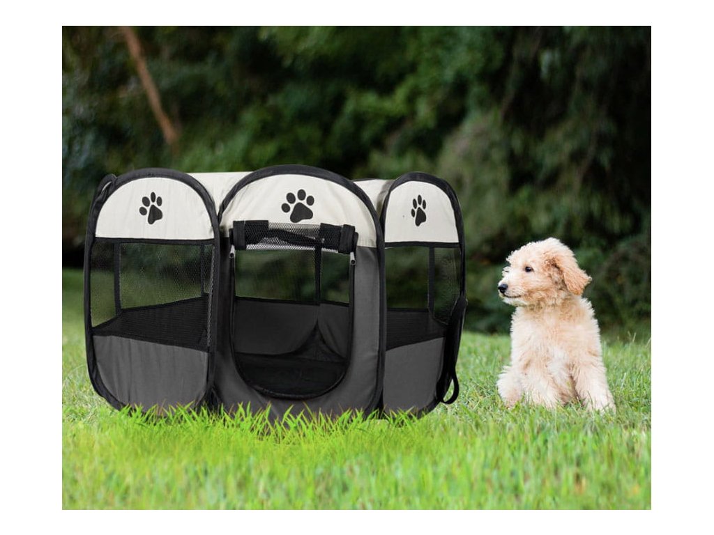 Skládací textilní ohrádka ve tvaru osmiúhelníku pro psy, štěňata, kočky a malá zvířata. Ohrádka je ideální pro majitele domácích mazlíčků, zejména pokud potřebují bezpečný prostor pro své mazlíčky. Výrobek je vhodný pro použití v interiéru i exteriéru.