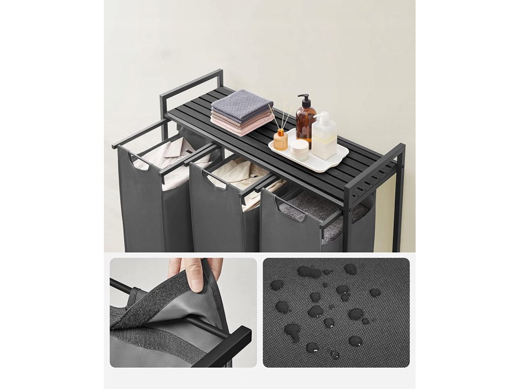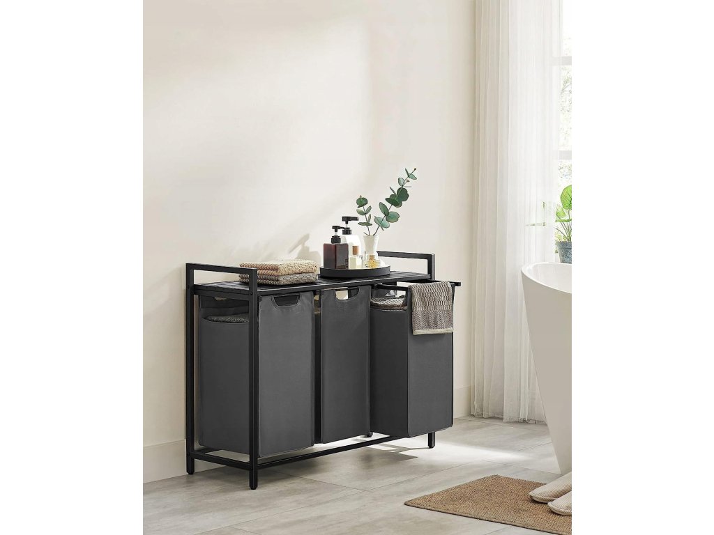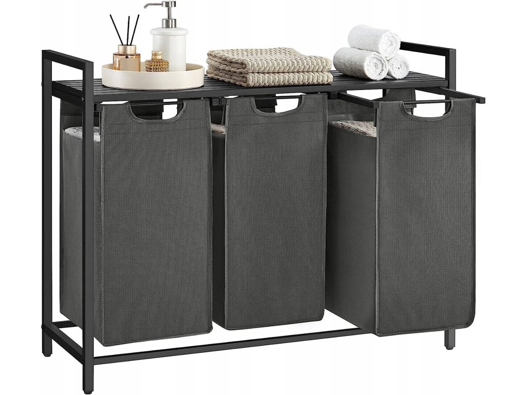 Praktický tříkomorový koš na prádlo s celkovým objemem 114 litrů je vyroben z velmi dobře vypadajících MDF lamel spojených ocelovým rámem. Díky volbě materiálů je výrobek odolný proti případnému poškození. Nádobu lze použít v prádelně, koupelně nebo i v dětském pokoji jako koš na hračky. Uspořádejte si domácnost ještě dnes díky tříkomorovému koši na prádlo, který vám usnadní třídění prádla. Díky své všestrannosti a praktičnosti se stane jedním z vašich oblíbených kusů domácího nábytku. Nábytek v loftovém stylu je nejnovějším módním trendem. Koš na prádlo se jistě hodí do mnoha místností. Ocelová konstrukce zajišťuje stabilitu nábytku. Dokonalé sladění rámových prvků a černého rámu horní části dodá vašemu interiéru půvabný nádech. Postarejte se o estetiku své koupelny, prádelny nebo dětského pokoje výběrem osvědčených výrobků nejvyšší kvality.