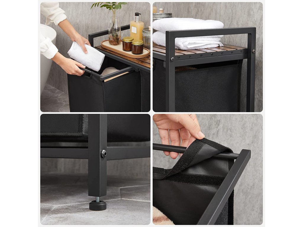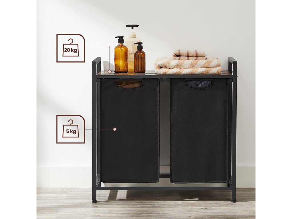 Praktický dvoukomorový koš na prádlo a pračku s celkovým objemem 92 l byl vyroben z velmi pohledných MDF lamel spojených ocelovým rámem. Díky správné volbě materiálů je výrobek odolný vůči případnému poškození.
