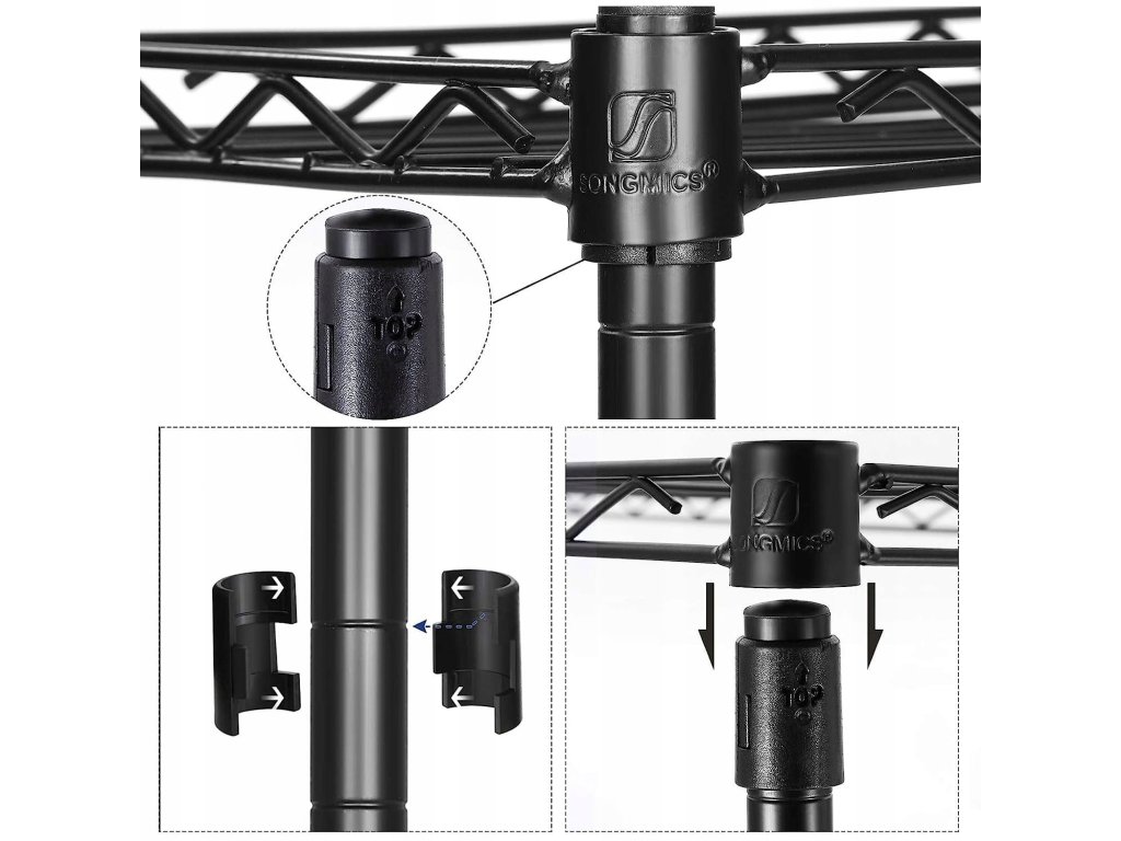- Materiál: práškově lakovaná ocel, polypropylenové vložky polic