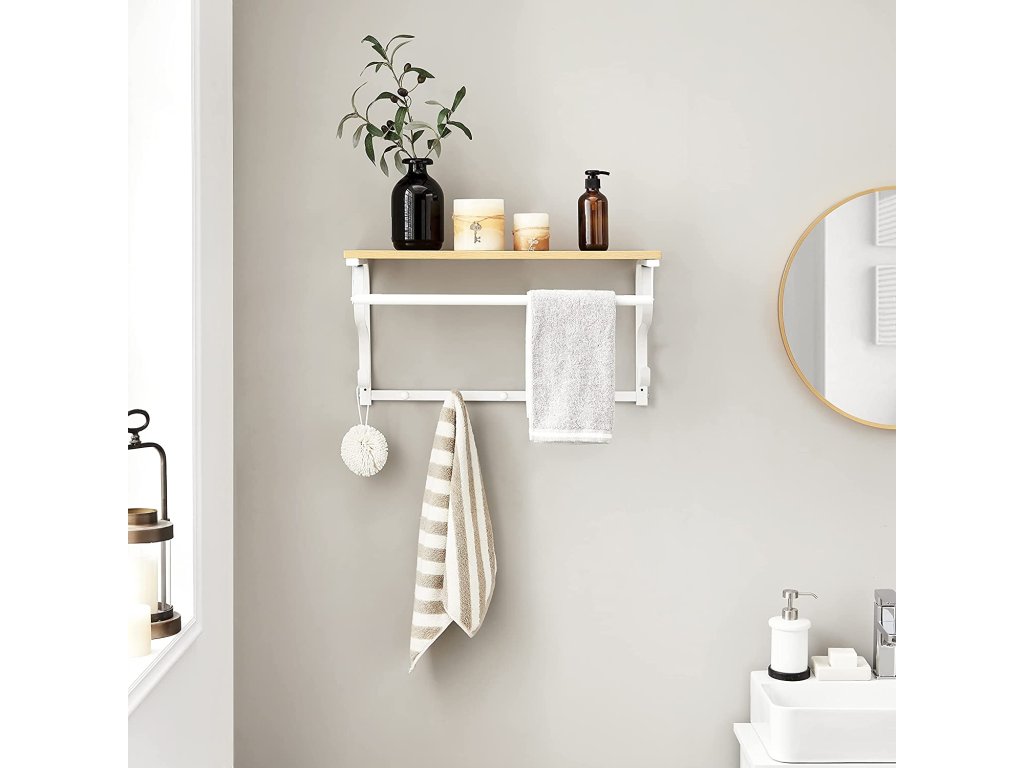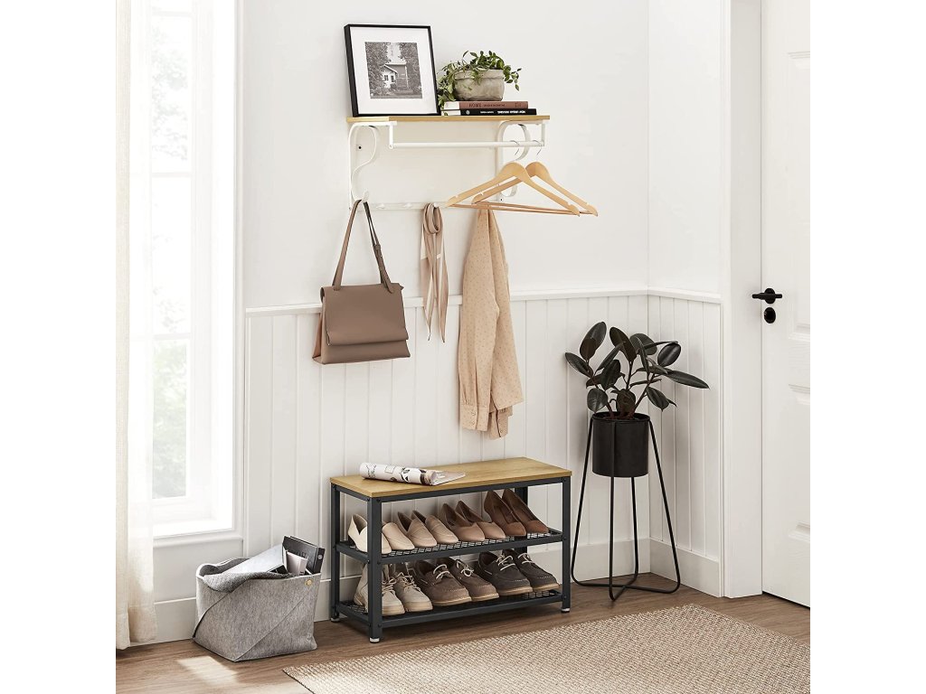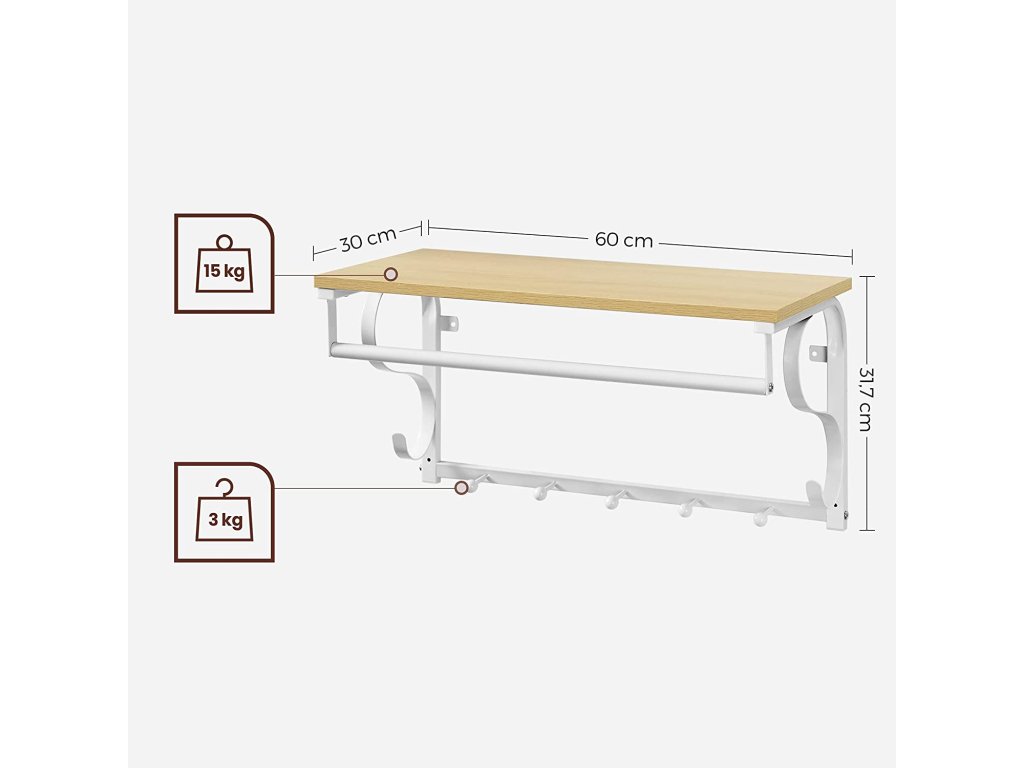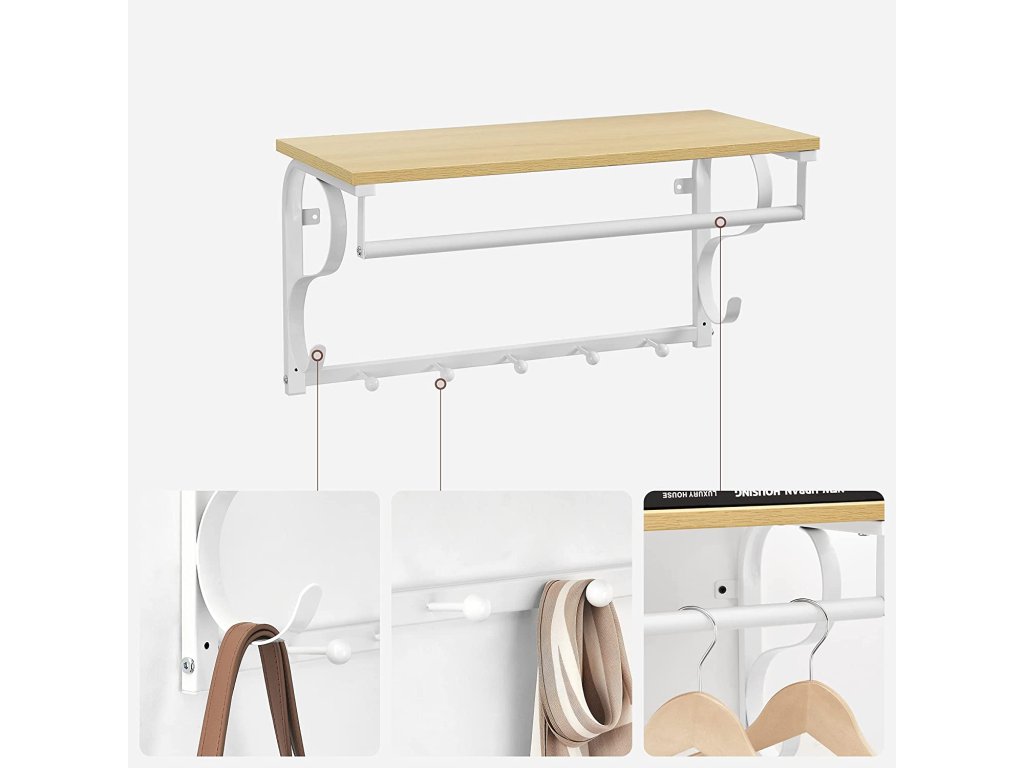 Tento prostorově úsporný výrobek má stabilní polici, na kterou můžeme umístit květiny v květináčích, deštníky, batohy, klobouky, čepice nebo jednoduše umístit naše krásně zarámované fotografie a knihy. Kromě toho je výrobek vybaven 5 zaoblenými háčky na odkládání kabátů, bund, tašek nebo klíčů a stabilní tyčí, na kterou můžeme zavěsit bundy a kabáty umístěné na věšáku.