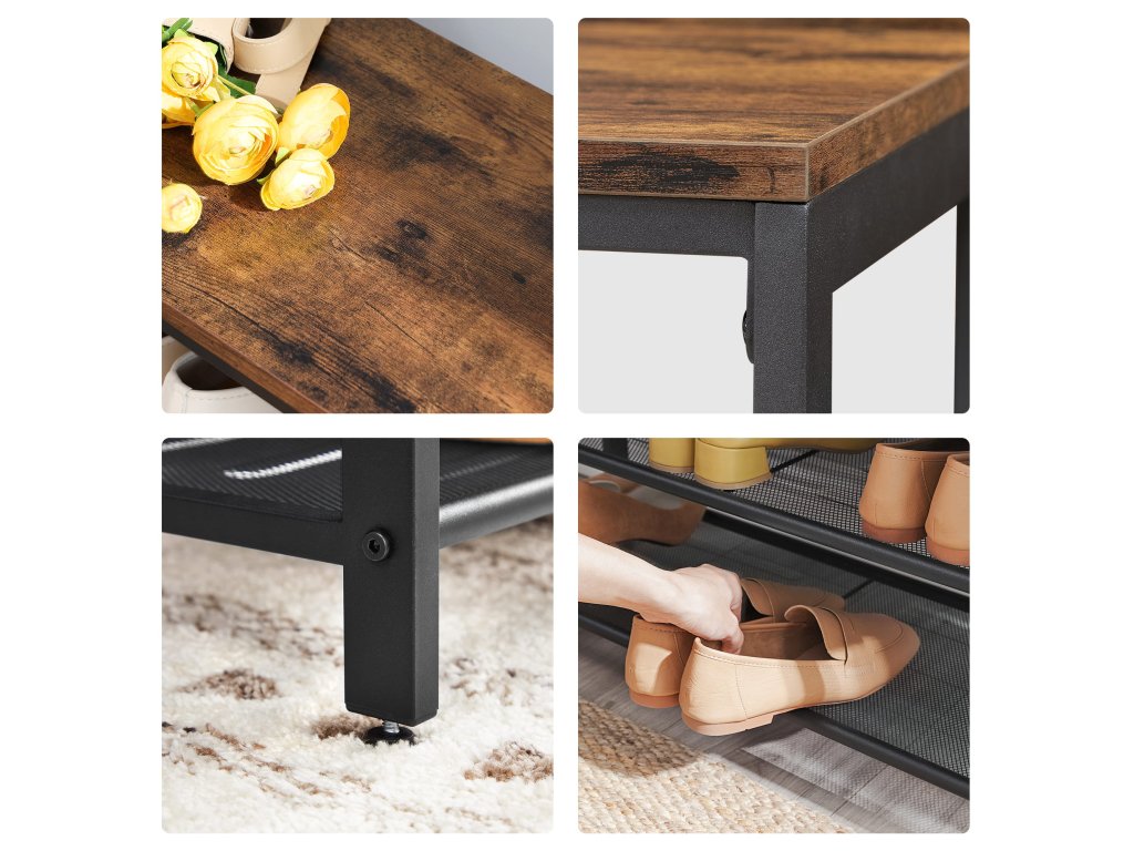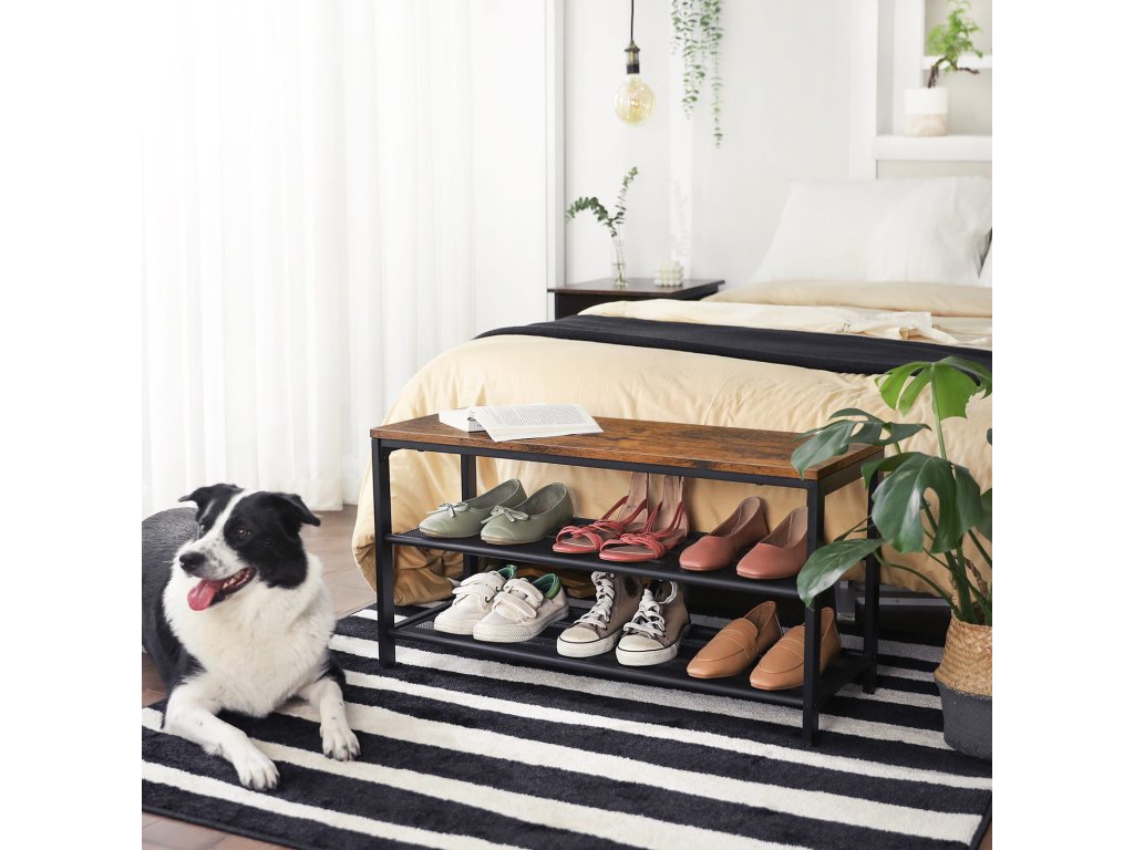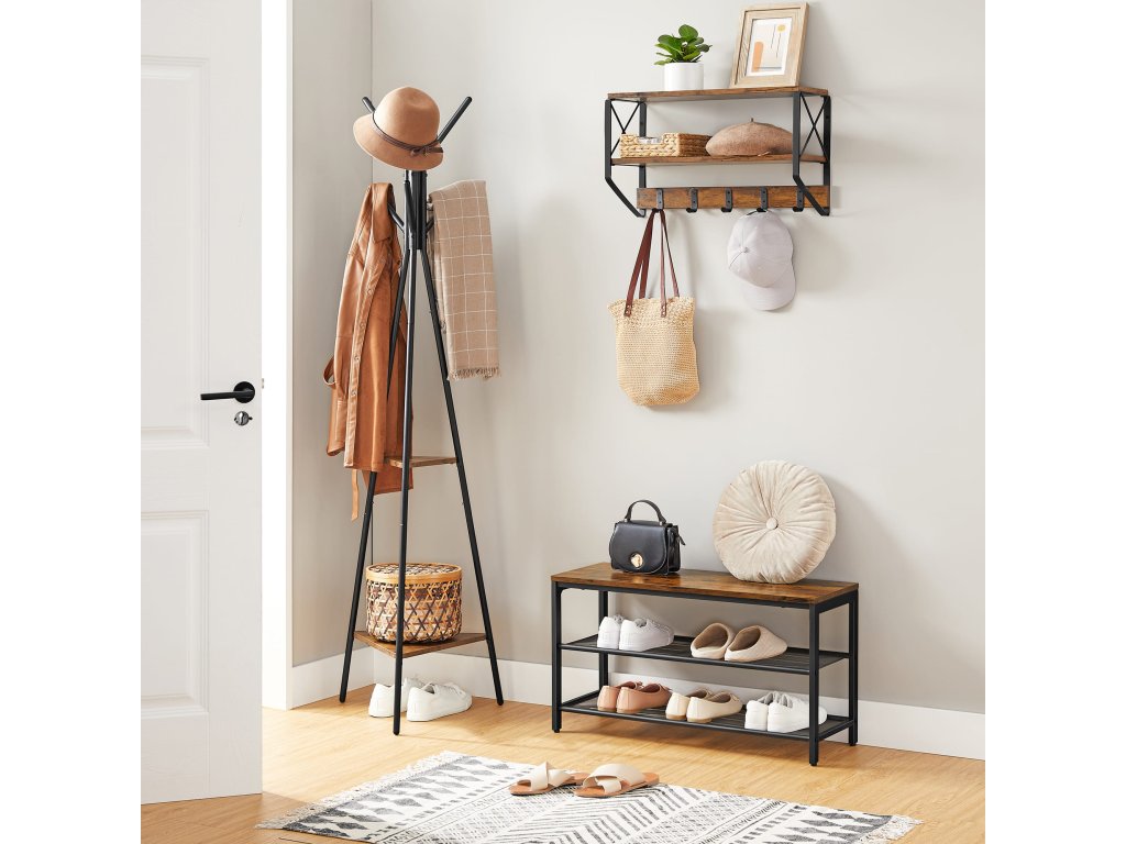 Průmyslový botník s policí je velmi praktický a elegantní kus nábytku, který najde své uplatnění v předsíni, chodbě, kanceláři, recepci, hale nebo obchodě.