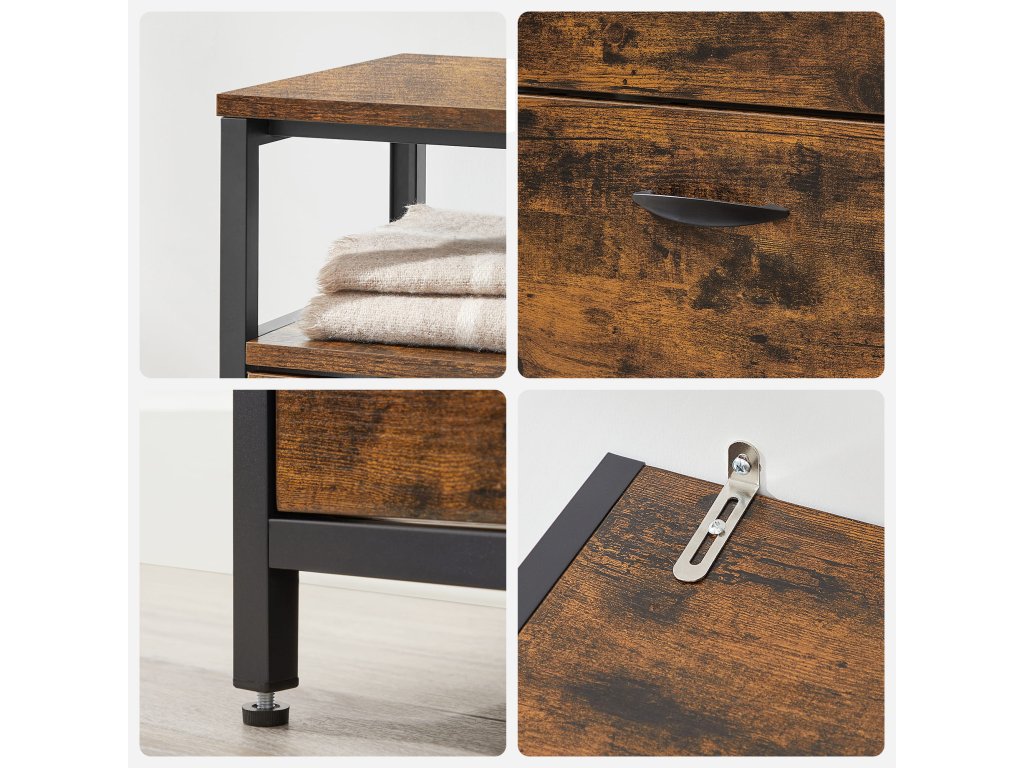 Výrobek je vyroben převážně z dřevotřískových desek, které jsou trvanlivou surovinou, odolnou proti vlhkosti a deformaci. Skříňka jistě zapadne do interiéru mnoha interiérů.
