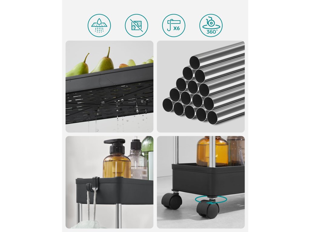 Regál má 4 police, které umožňují ukládat kuchyňské výrobky, potraviny nebo čisticí prostředky, kosmetiku a další potřebné doplňky, pokud má být regál umístěn v koupelně nebo prádelně.