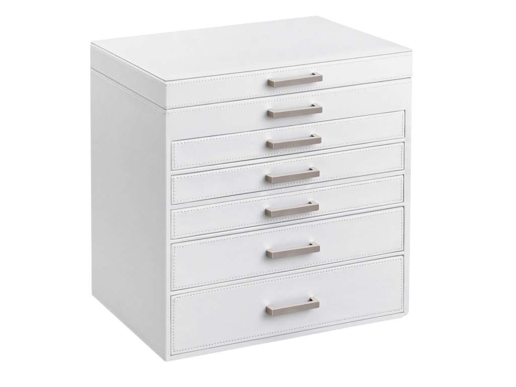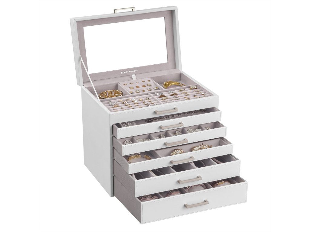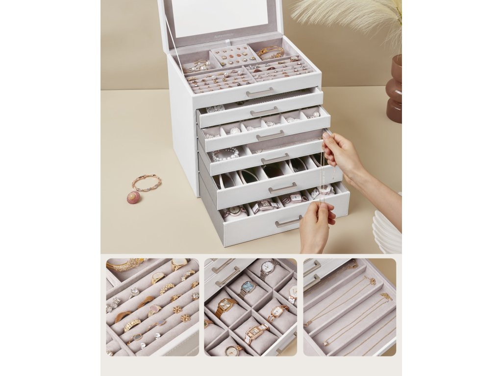 - 5 výsuvných zásuvek, které jsou rozděleny do různě velkých přihrádek, kam můžeme umístit hodinky, náramky a další cennosti.