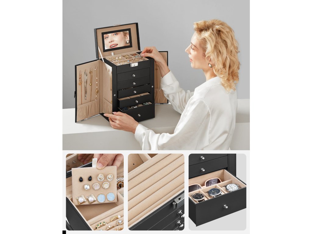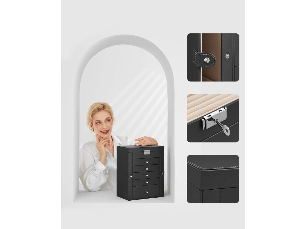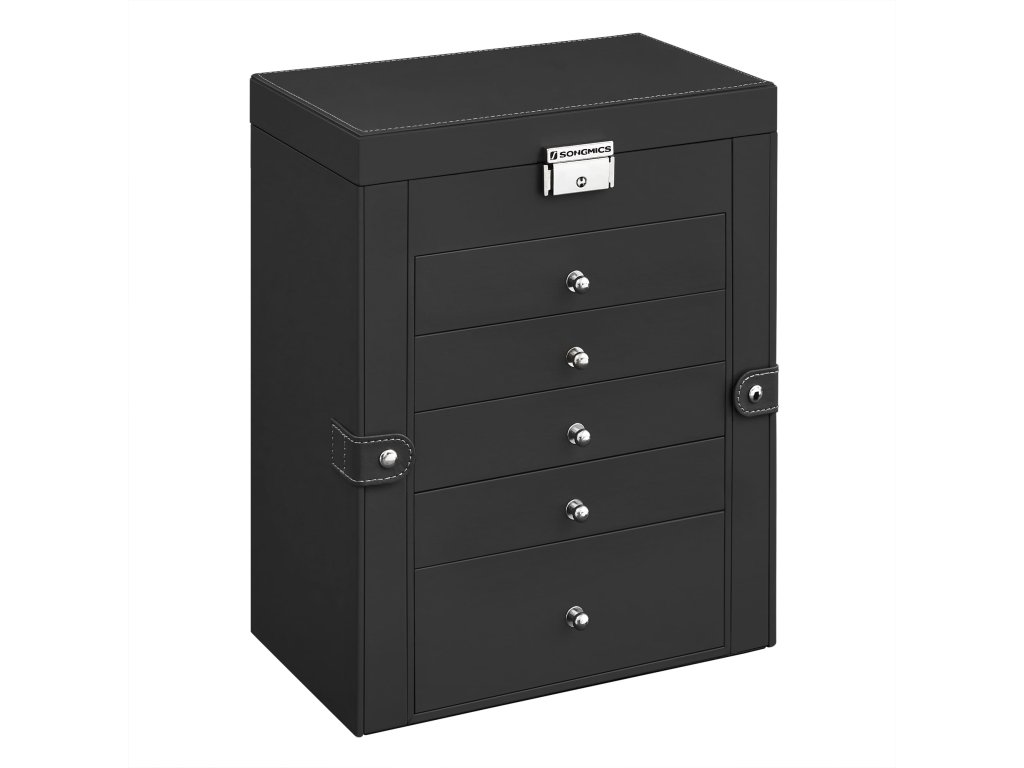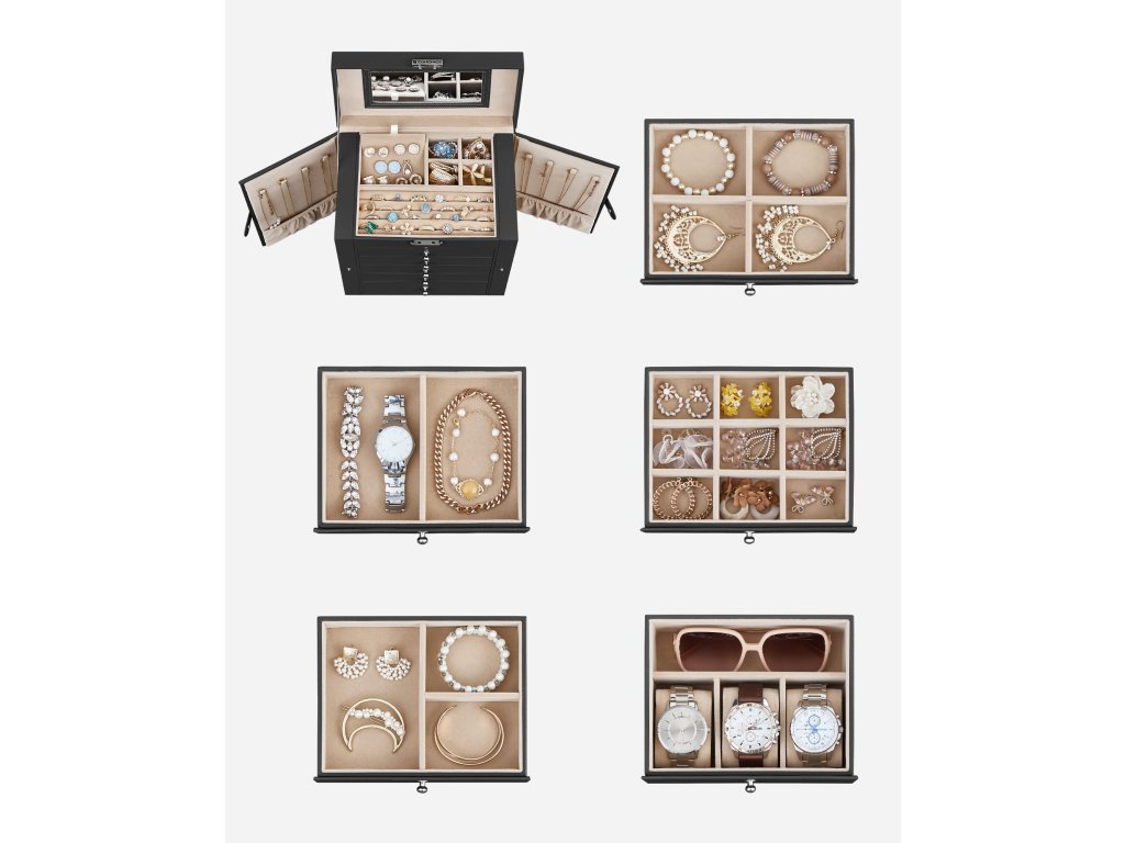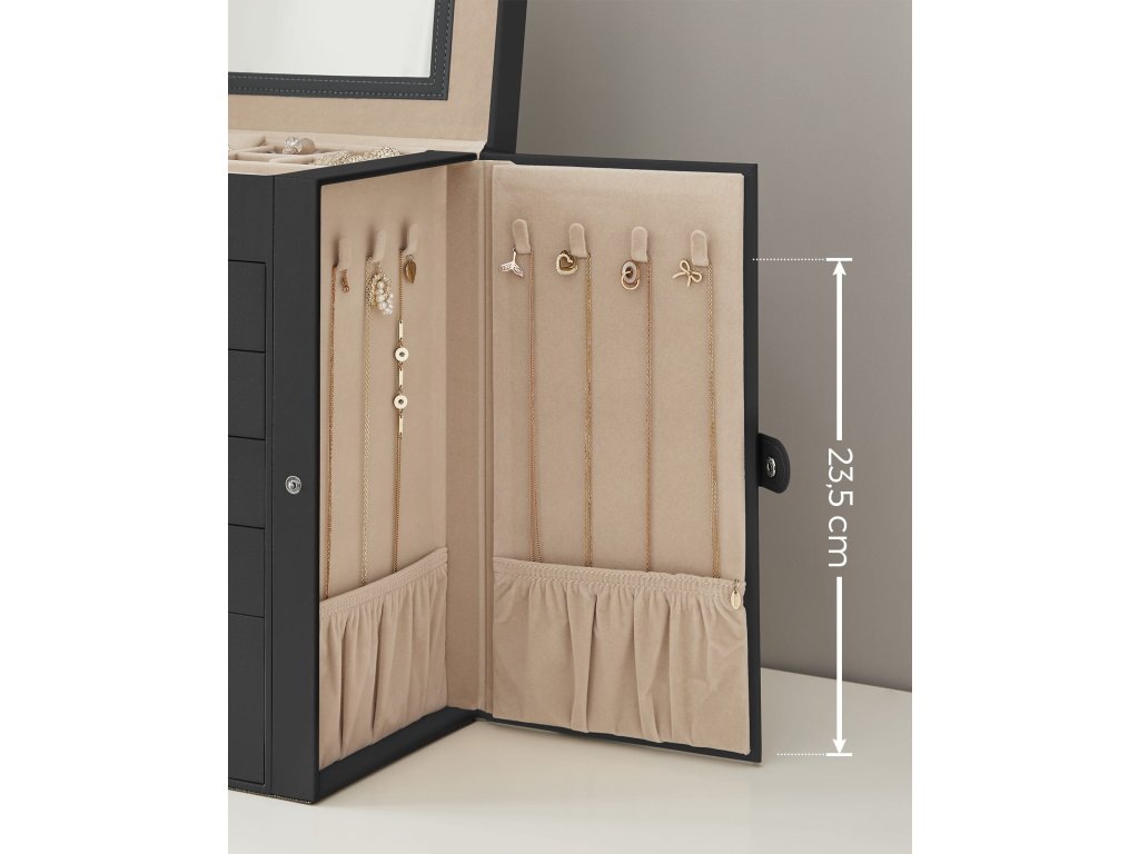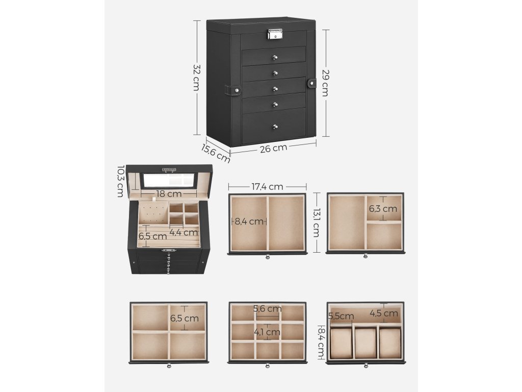 - 5 výsuvných zásuvek, které jsou rozděleny do různě velkých přihrádek, kam můžeme umístit hodinky, náramky a další cennosti.