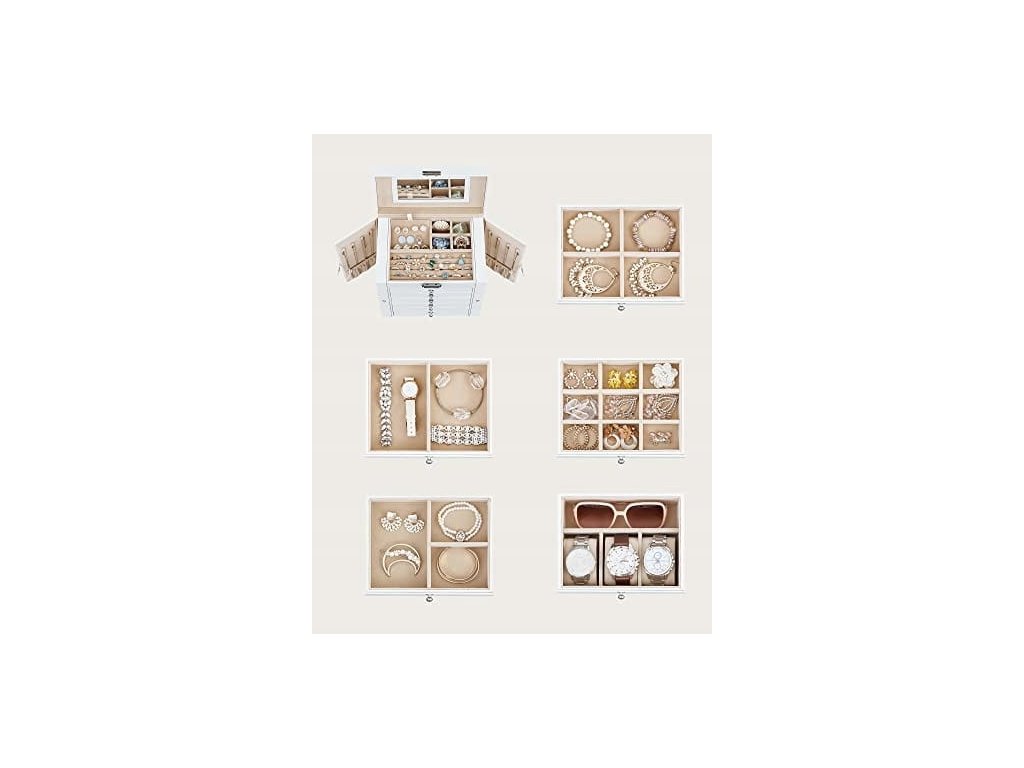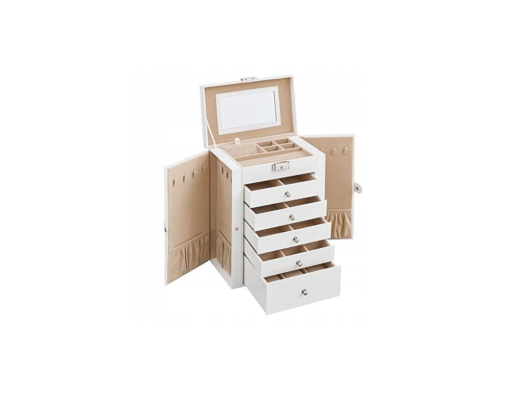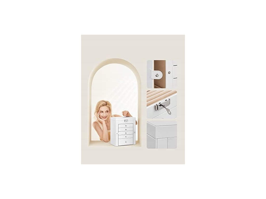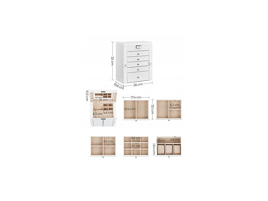 - 5 výsuvných zásuvek, které jsou rozděleny do různě velkých přihrádek, kam můžeme umístit hodinky, náramky a další cennosti.