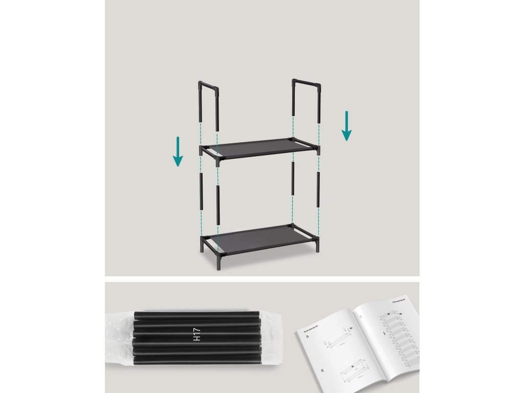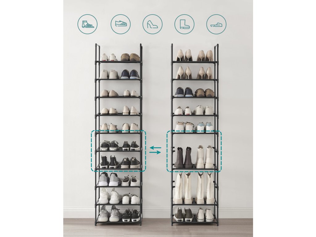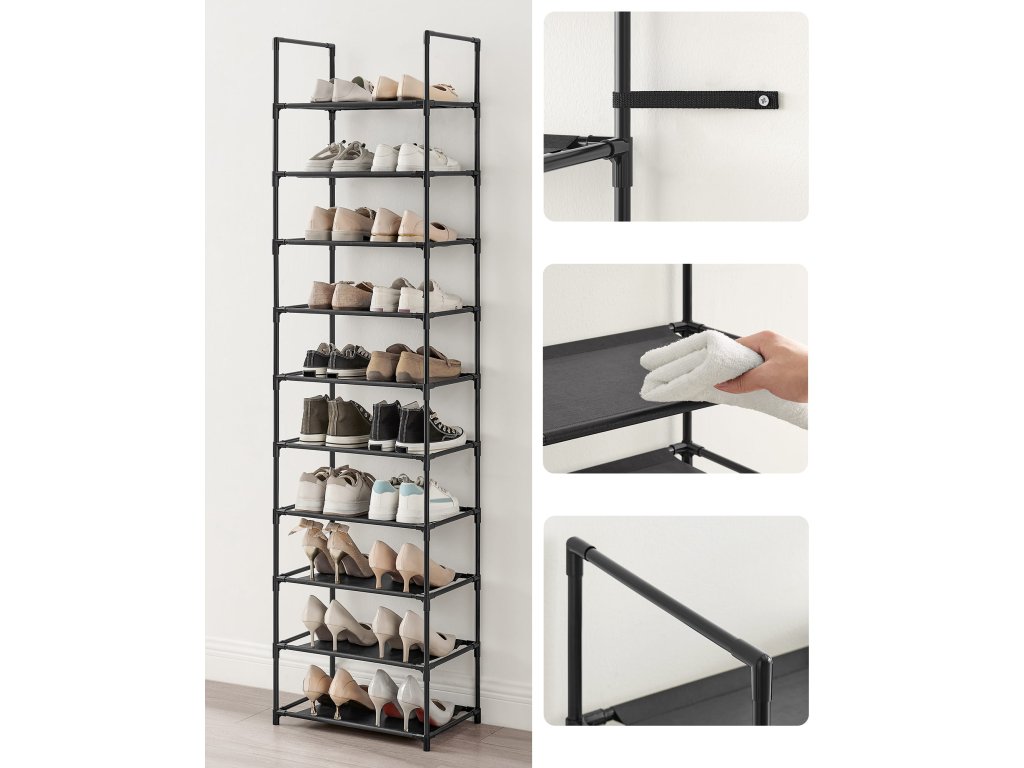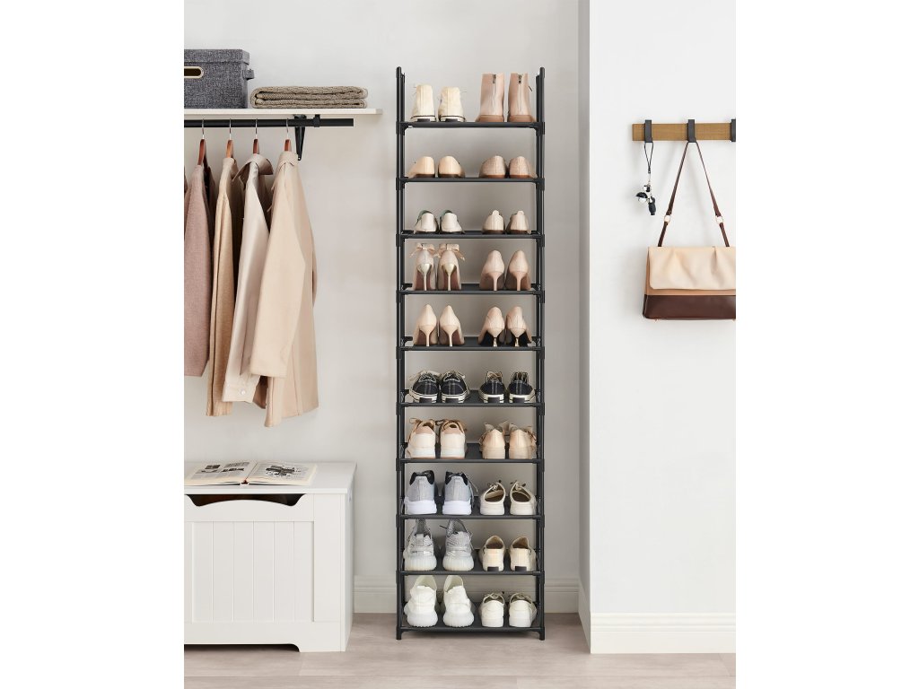 Regál má 10 polic na boty, které pojmou až 20 párů bot v závislosti na jejich velikosti.