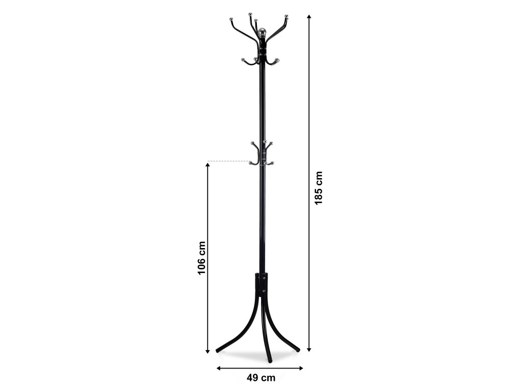 STOJANOVÝ VĚŠÁK Ideální pro domácnost i kancelář Stabilní kovová konstrukce 16 háčků na zavěšení oděvů Krytky chránící podlahu před poškrábáním design V DOBRÉM STYLU Stojanový věšák na oblečení je skvělým doplňkem do každé předsíně, šatny nebo šatny. Vyznačuje se skvělou funkčností a stabilní konstrukcí a díky svému jedinečnému designu a tvaru stromu skvěle doplní každý interiér. Bude se dobře vyjímat v předsíni, čekárně i kanceláři. Věšák na kabáty od Věšák má v horní části pět háčků a na každém z nich dvě místa pro zavěšení oblečení. Uprostřed věšáku jsou další tři malé háčky na zavěšení tašek, deštníků a menších kusů oblečení. Díky speciální trojité základně si věšák zachovává stabilitu i při velkém zatížení. TECHNICKÁ SPECIFIKACE: Kód výrobku:: GH-6006 BLACK Typ balení: speciálně vyztužený přepravní karton Barva: černá Konstrukce: kovová Návod k montáži: Polsko Doba montáže: 15 min Výrobek pro vlastní montáž Výrobce: Výška věšáku: 185 cm Výška pro menší háčky: hloubka věšáku: 106 cm Šířka: 49 cm Hloubka: 49 cmDoplňkové parametry