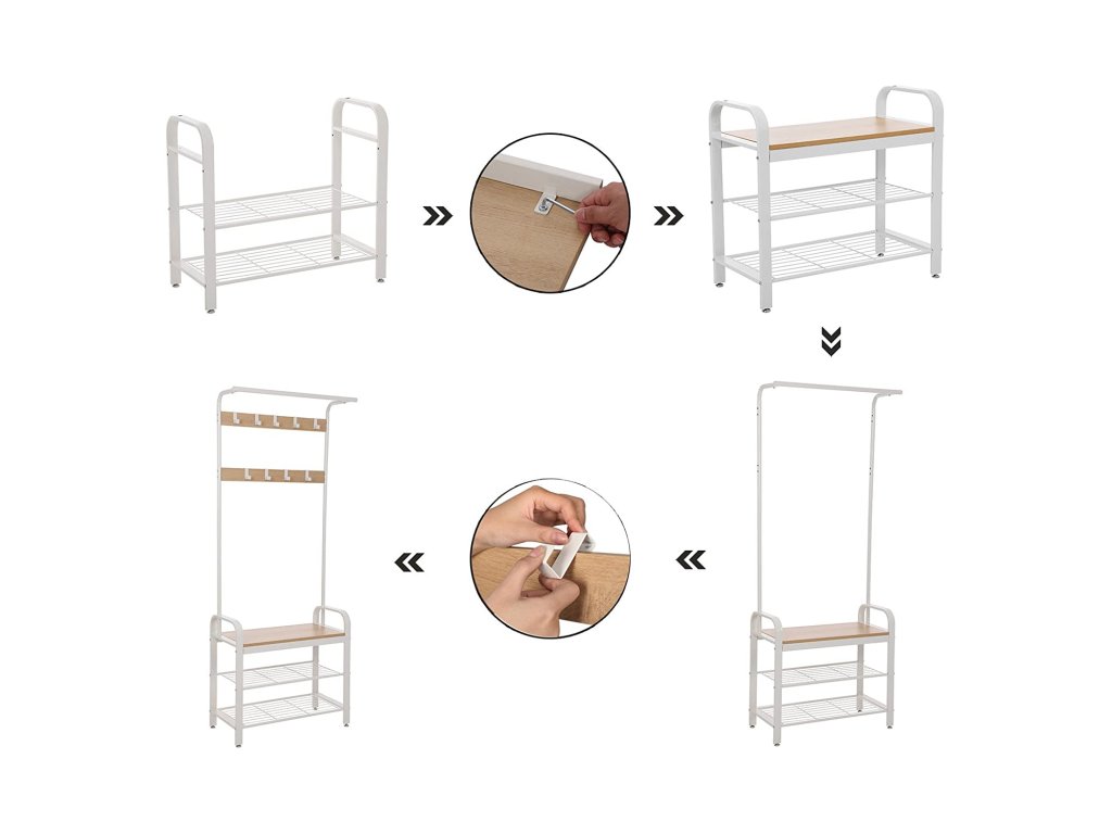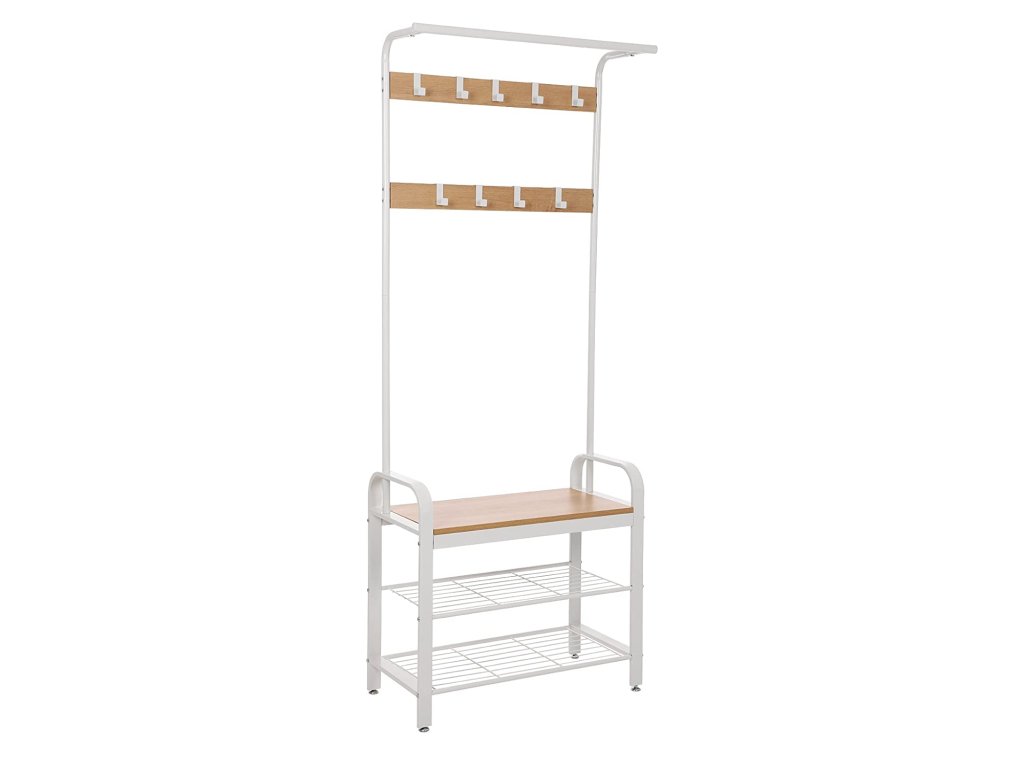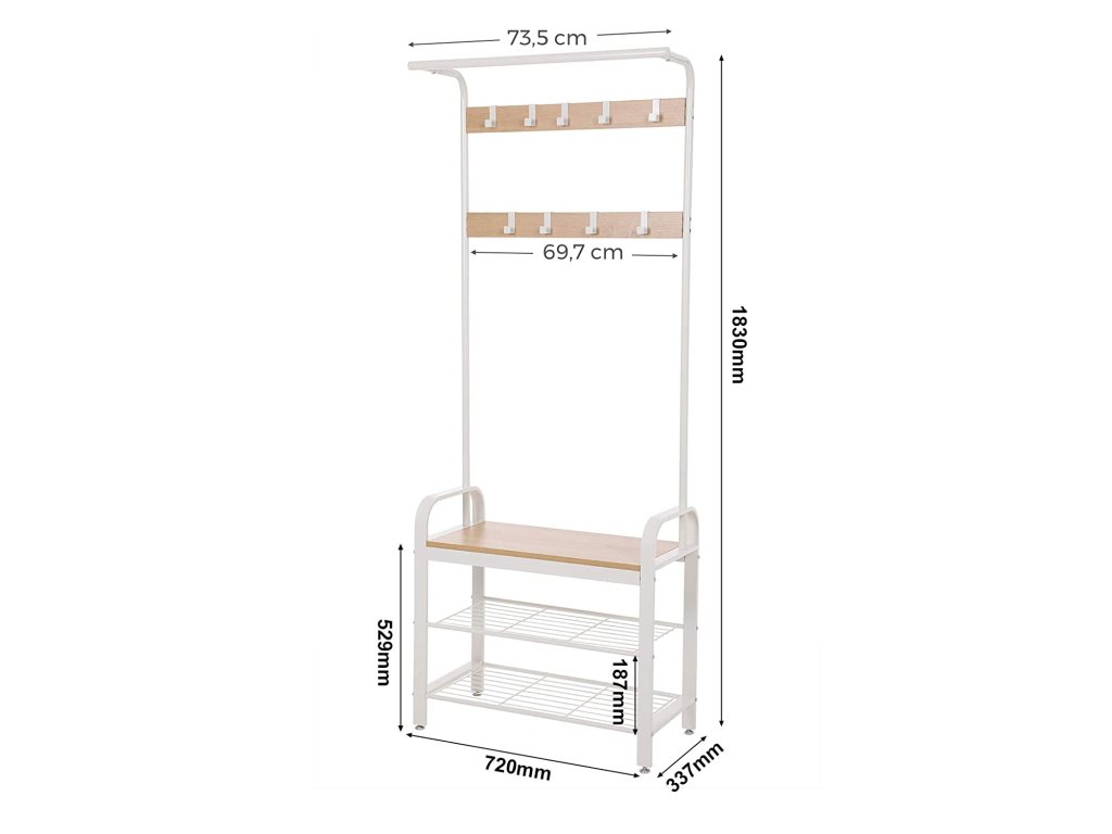 Stojan má celkem 9 háčků ve dvou řadách: první řada má 5 háčků, druhá řada 4. Háčky slouží k uložení kabátů, bund, tašek, klobouků nebo klíčů. Kromě toho má výrobek tyč, na kterou můžeme zavěsit šály, šátky nebo komíny. To je užitečné zejména v zimním období, kdy jsou šály nepostradatelnou součástí našeho oblečení. Na tyč můžeme umístit také bundy, kabáty nebo šaty a košile zavěšené na ramínkách, čímž získáme další úložný prostor pro naše věci.