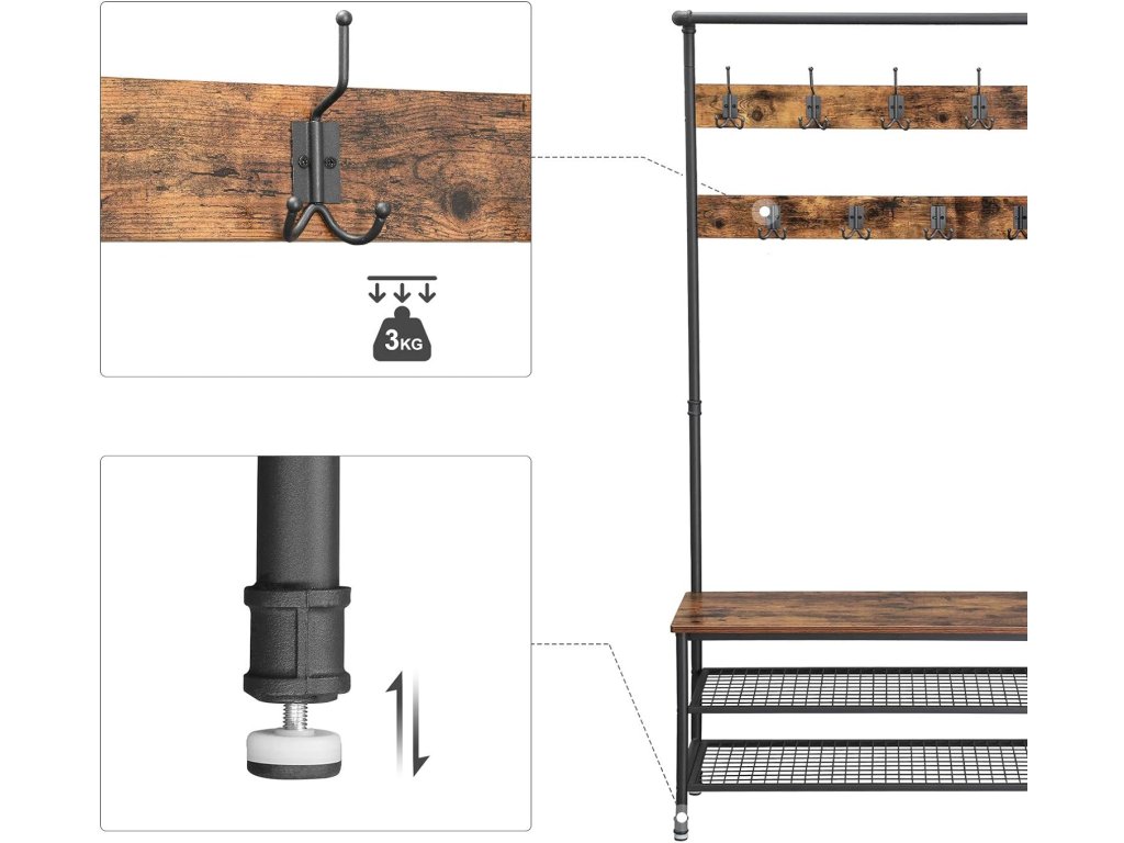 Věšák má celkem 23 háčků uspořádaných do 2 řad: první řada má 15 háčků, druhá řada 8. Háčky slouží k uložení kabátů, bund, tašek, klobouků nebo klíčů. Kromě toho má výrobek tyč, na kterou můžeme zavěsit šály, šátky nebo komíny. To se hodí zejména v zimním období, kdy jsou šály nepostradatelnou součástí našeho oblečení. Tyč lze také použít k zavěšení bund, kabátů nebo šatů a košil na ramínka, čímž získáte další úložný prostor pro své věci.