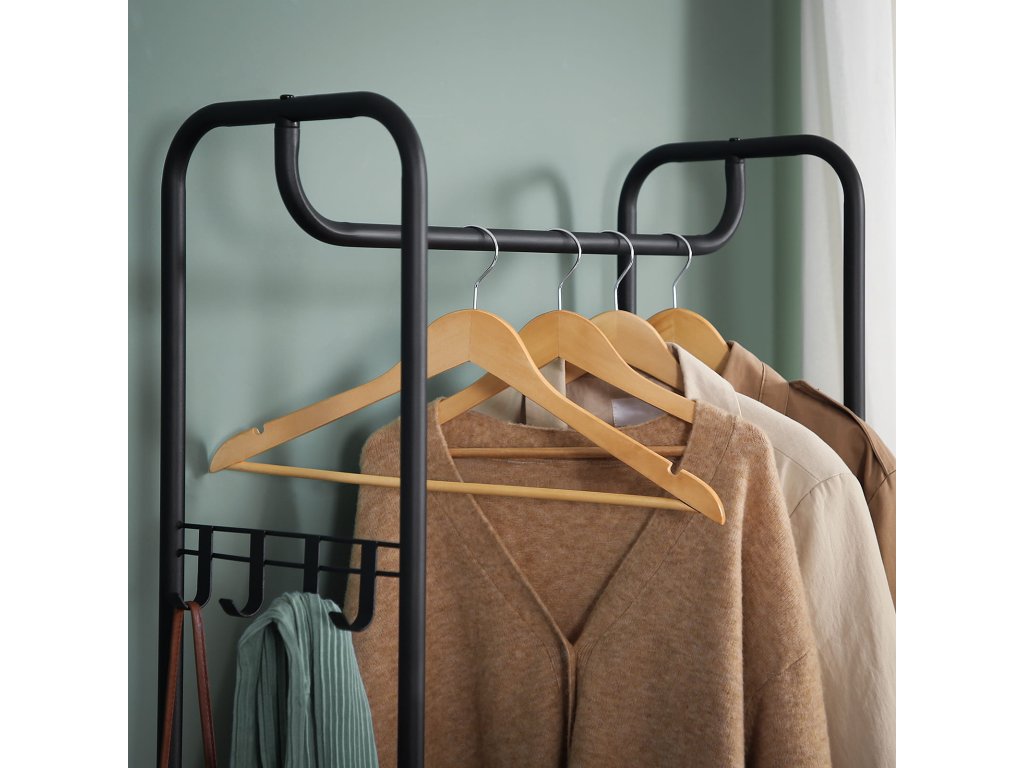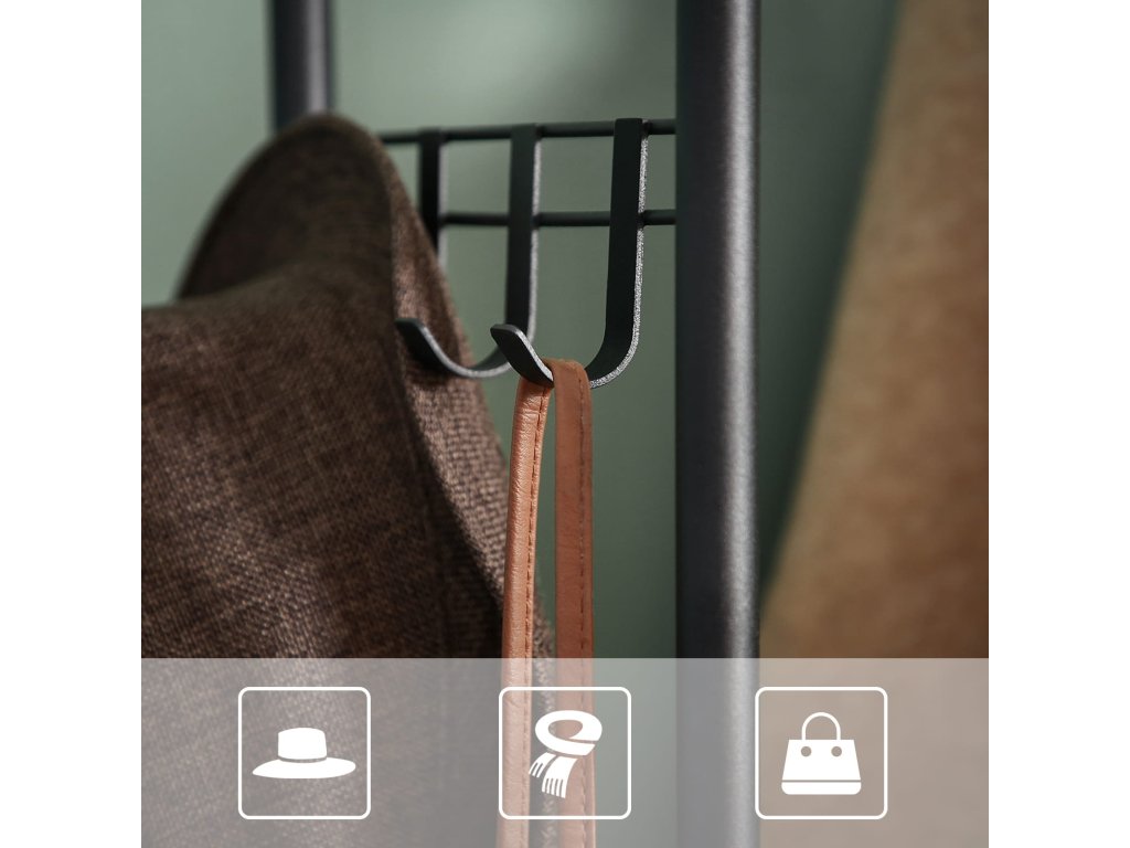 Stojan má 4 háčky. Výrobek je vybaven tyčí, na kterou můžeme zavěsit šátky, šály nebo komíny. Je užitečný zejména v zimním období, kdy jsou šály nepostradatelnou součástí našeho oblečení. Na tyč můžeme umístit také bundy, kabáty nebo šaty a košile zavěšené na ramínkách, čímž získáme další úložný prostor pro naše věci.