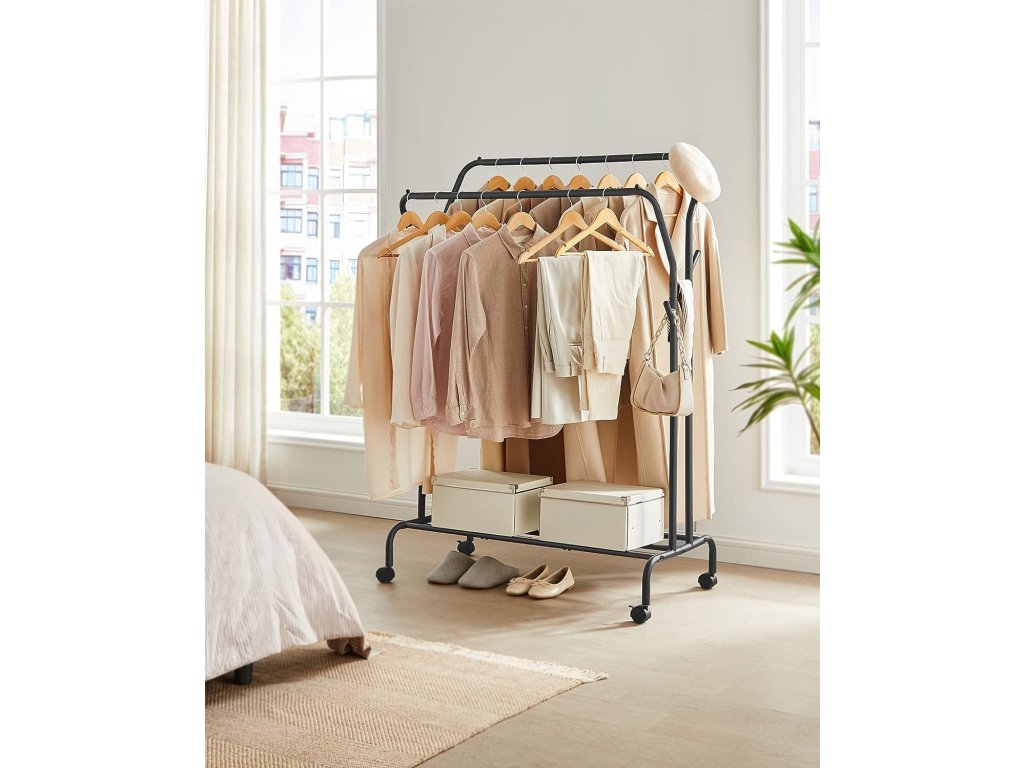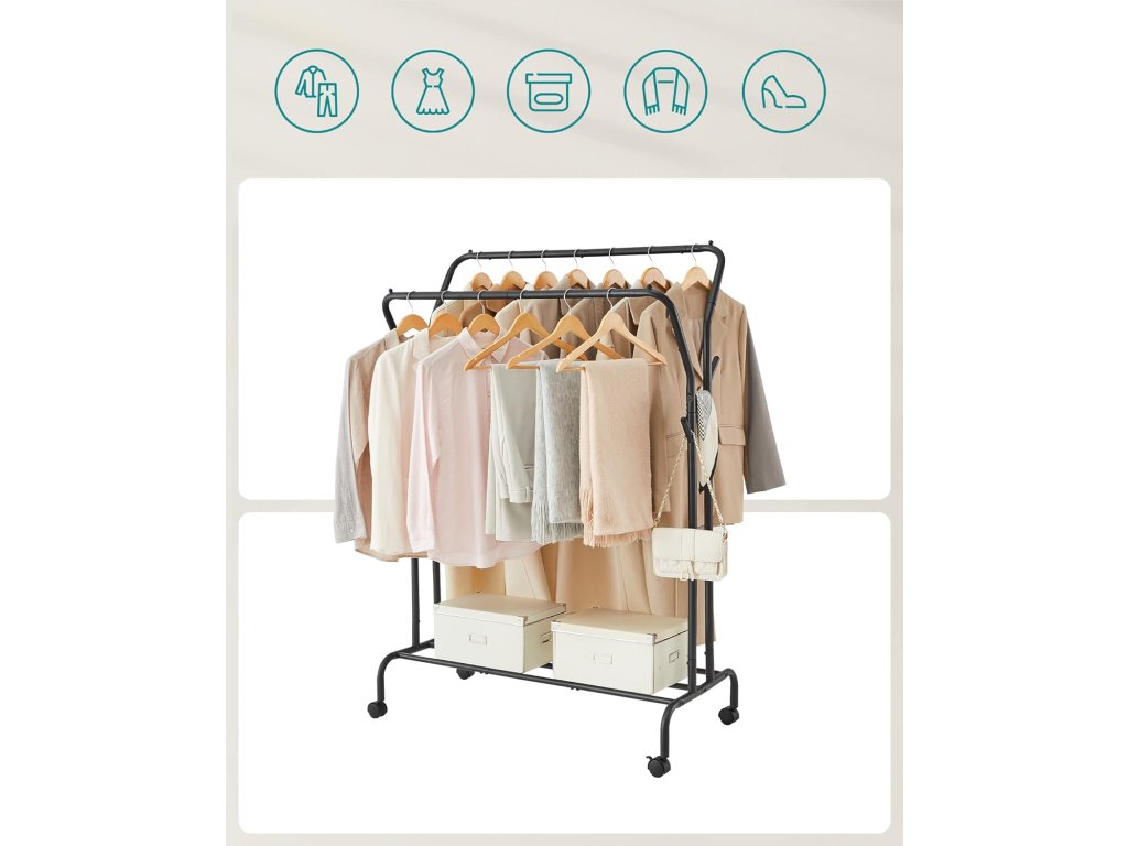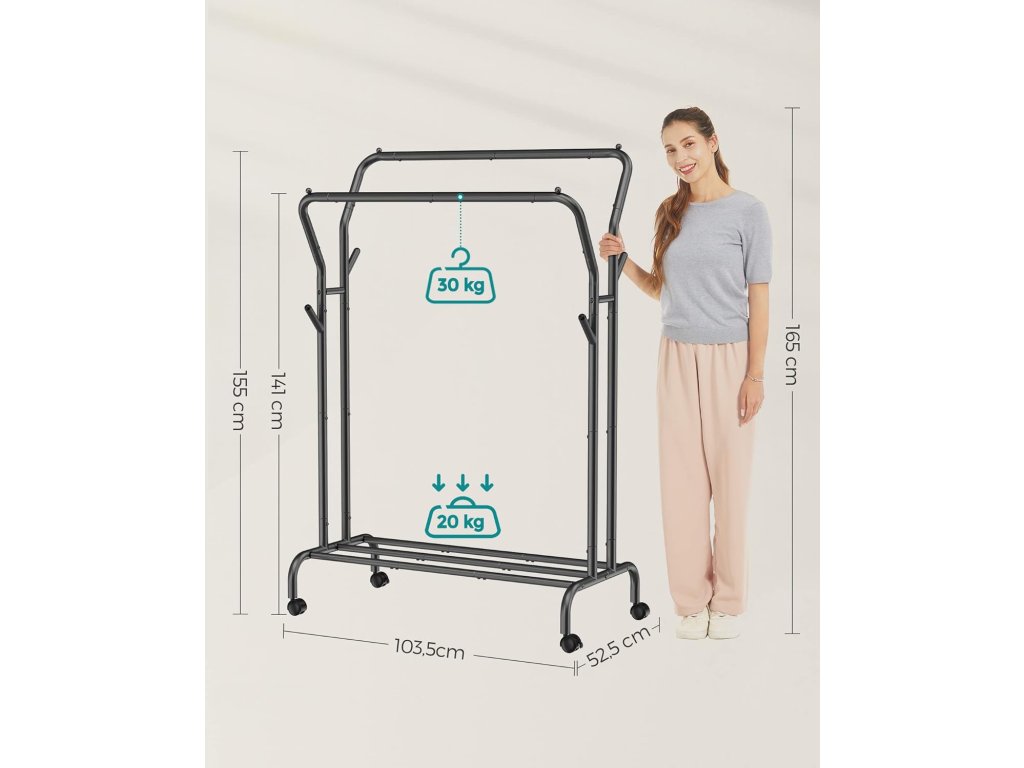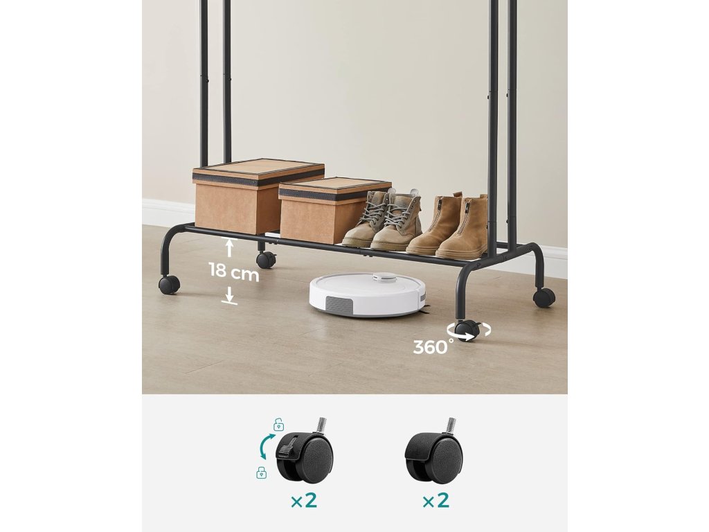 Věšák má kolečka, takže je velmi mobilní. Dvě z koleček jsou uzamykatelná. Dobře otočná kolečka usnadňují přemístění věšáku do vybrané místnosti. Chcete si vyzkoušet šaty před rande nebo důležitou obchodní schůzkou? Není nic jednoduššího, stačí věšák posunout blíže k zrcadlu a můžete si vyzkoušet, co se vám líbí. Díky speciálně navržené konstrukci tyčí se oblečení pohodlně vejde na obě tyče. Větší prostor mezi tyčemi ochrání vaše oblečení před pomačkáním jako u jiných ramínek.