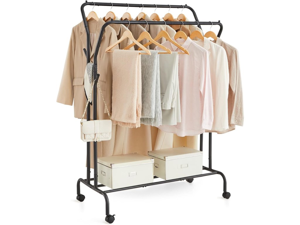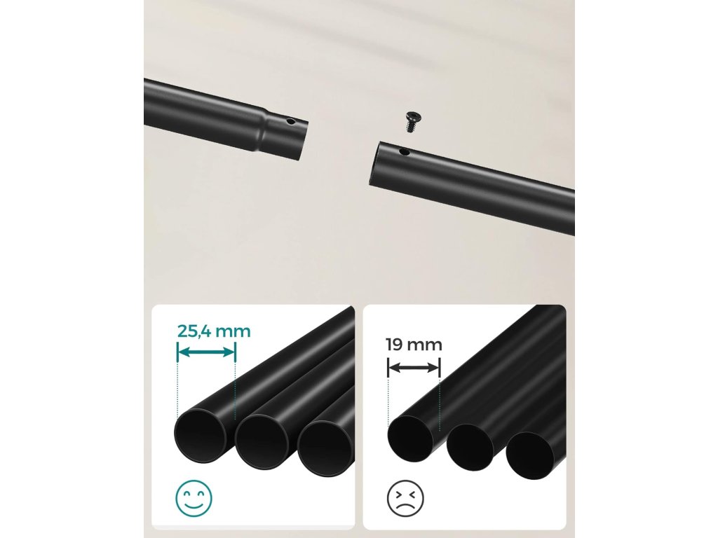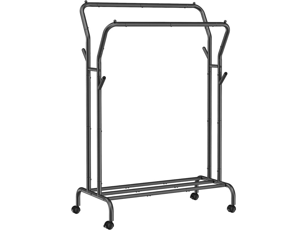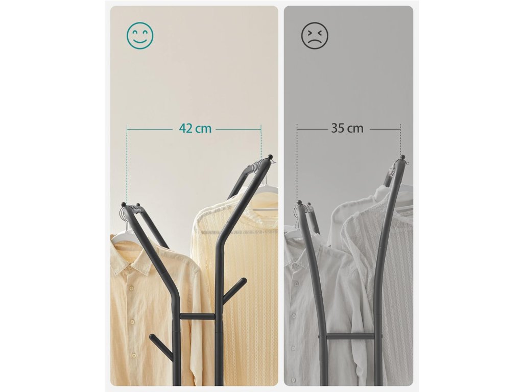 Věšák má kolečka, takže je velmi mobilní. Dvě z koleček jsou uzamykatelná. Dobře otočná kolečka usnadňují přemístění věšáku do vybrané místnosti. Chcete si vyzkoušet šaty před rande nebo důležitou obchodní schůzkou? Není nic jednoduššího, stačí věšák posunout blíže k zrcadlu a můžete si vyzkoušet, co se vám líbí. Díky speciálně navržené konstrukci tyčí se oblečení pohodlně vejde na obě tyče. Větší prostor mezi tyčemi ochrání vaše oblečení před pomačkáním jako u jiných ramínek.
