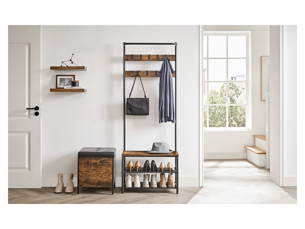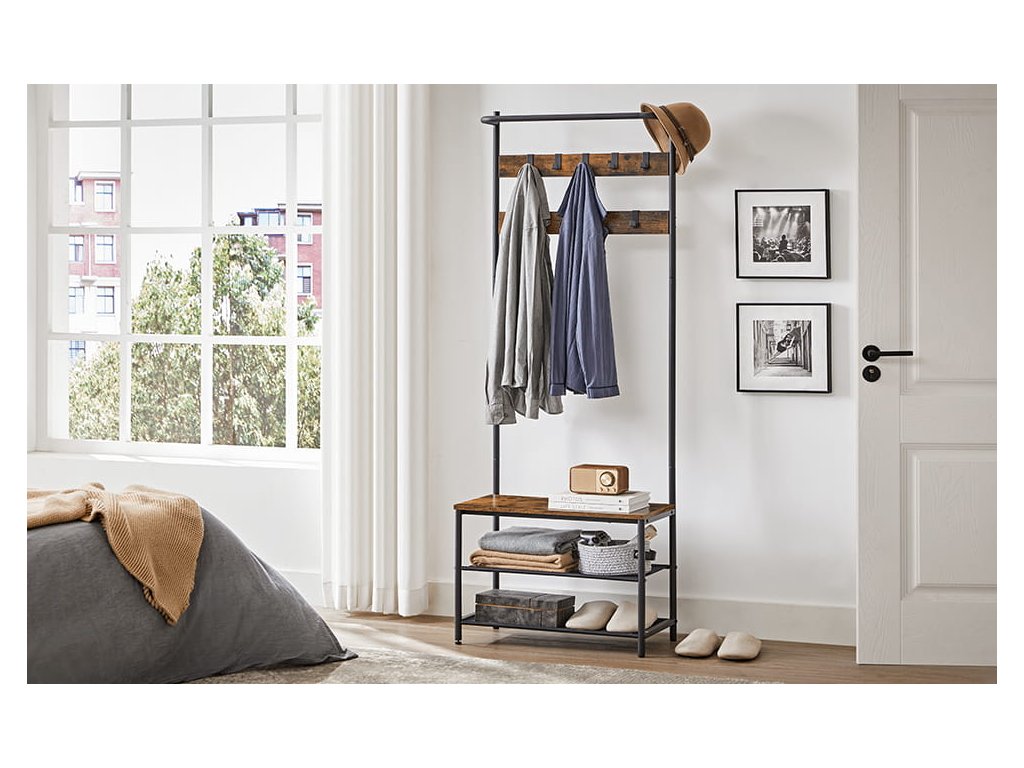 Máte už dost nepořádku na chodbě nebo v předsíni? Bundy a kabáty se povalují na židlích a křeslech v obývacím pokoji a jídelně, místo aby visely na věšáku? Pokud je odpověď ano, pak jste na správném místě. Představujeme vám věšák na oblečení se sedákem a policemi na boty, který vnese pořádek a čistotu. Tento praktický kus nábytku uspořádá vaše svrchní oblečení, doplňky a další drobnosti, jako jsou například klíče. Věšák má celkem 9 háčků uspořádaných ve 2 řadách. Háčky slouží k uložení kabátů, bund, tašek, klobouků nebo klíčů. Kromě toho má výrobek tyč, na kterou můžeme zavěsit šály, šátky nebo komíny. To je užitečné zejména v zimním období, kdy jsou šály nepostradatelnou součástí našeho oblečení. Na tyč můžeme také umístit bundy, kabáty nebo šaty a košile zavěšené na ramínkách, čímž získáme další úložný prostor pro naše věci. Pod věšákem se nacházejí 2 robustní a prostorné police na boty, které přispějí k organizaci obuvi v domácnosti, a sedátko, které nám umožní jejich efektivní odkládání. Výrobek se osvědčí v každé předsíni nebo chodbě doma i v kanceláři. Ocelová konstrukce zajišťuje stabilitu kusu nábytku, takže se jedná o ideální výrobek pro všechna roční období, který oceníme zejména v zimním období, kdy na háčky zavěsíme těžké bundy a kabáty. Kromě dalšího svrchního oblečení a čerstvě vyžehlených košil a šatů najdou na tyči své místo také šály, šátky a komíny. Perfektně padnoucí policové prvky a rustikální sedací souprava dodají interiéru půvabný nádech. Postarejte se o estetiku své předsíně, chodby nebo kanceláře výběrem osvědčených výrobků nejvyšší kvality.